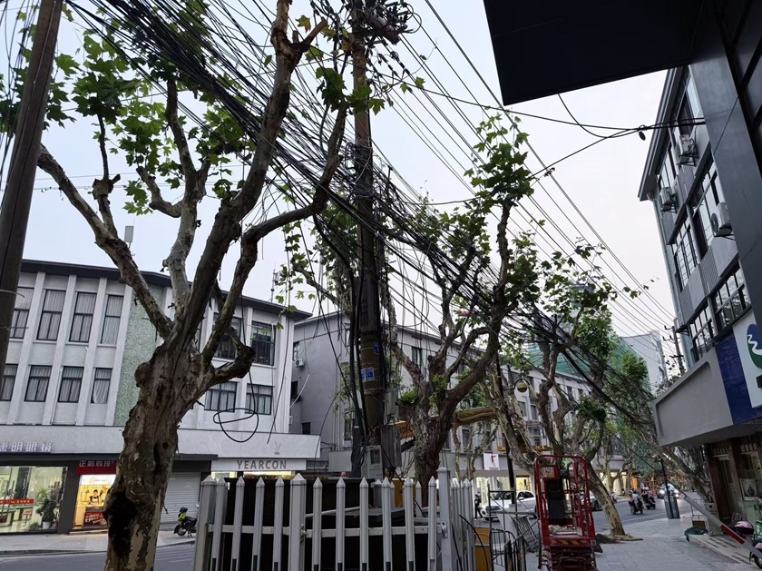 一条衣锦街,半部吴越史。衣锦街不仅承载着吴越文化的深厚底蕴,更见证了千年古城临安的变迁与发展。由于既有地下管道均已饱和,街道南北两侧的通信管网只能利用杆路架空线的方式进行布放,密密麻麻的缆线就像“蜘蛛网”笼罩在半空,既影响美观,也存在安全隐患。