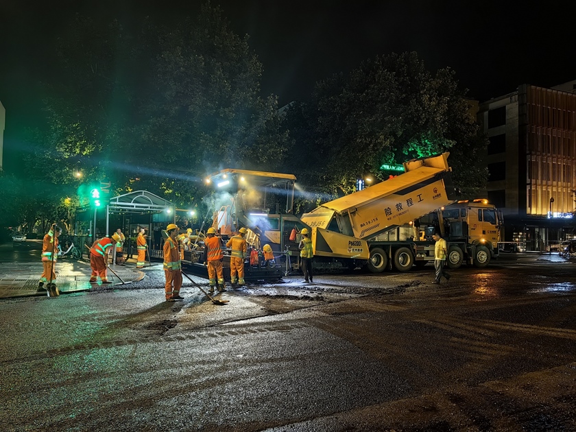 作为重要的东向西道路,环北天目工程现状交通压力大,交通导改难度高,道路沥青面层摊铺施工多安排在凌晨开展。