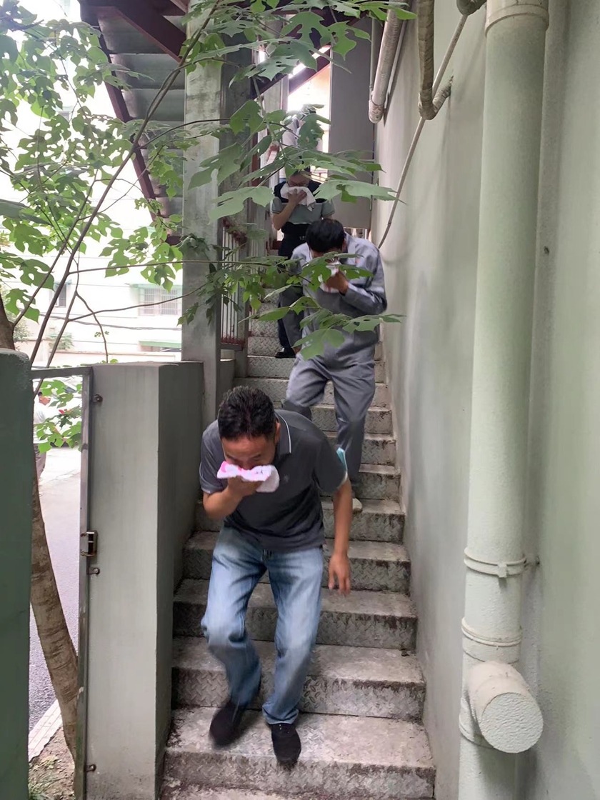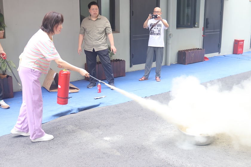 随着一阵急促的警报声,2023年度公寓消防演练拉开了序幕。听到警报声,公寓管家第一时间确认火情并逐个楼层通知租户撤离,租户用湿毛巾捂着口鼻,弯着腰,沿着公寓就近楼梯口有序地撤离到公寓一层的安全地带,同步,公寓管家拨打119火警电话报警。人员全部撤离后,公寓管家立即清点租客人数,确保无一人受困。随后在公寓一楼花园,进行了灭火器实操演练,安全员向大家讲解了灭火器使用规范,公寓租客代表和公司部分员工进行了灭火器实操。