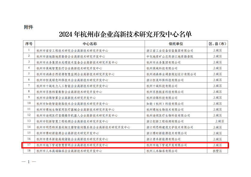 近日,杭州市科学技术局发布《杭州市科学技术局关于认定2024年杭州市企业高新技术研究开发中心的通知》,集团申报的杭州市地下管道智慧管网企业高新技术研究开发中心位列其中,正式获批!